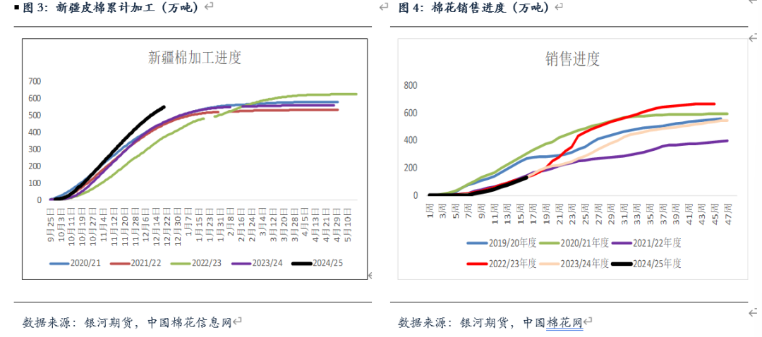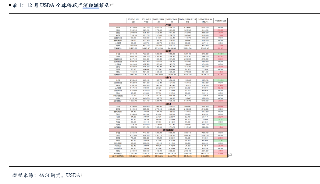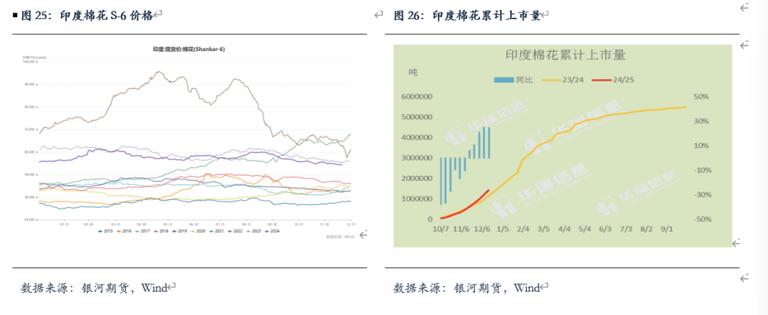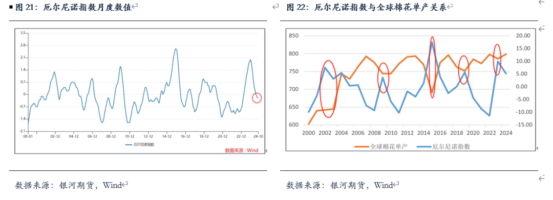 国际市场:产量方面,考虑到该阶段是北半球棉花播种生长季,棉花播种面积以及天气情况将是市场主要关注因素,预计2025年度气候对棉花生长较为有利,全球棉花产量在无明显极端天气影响下有小幅增产的可能。