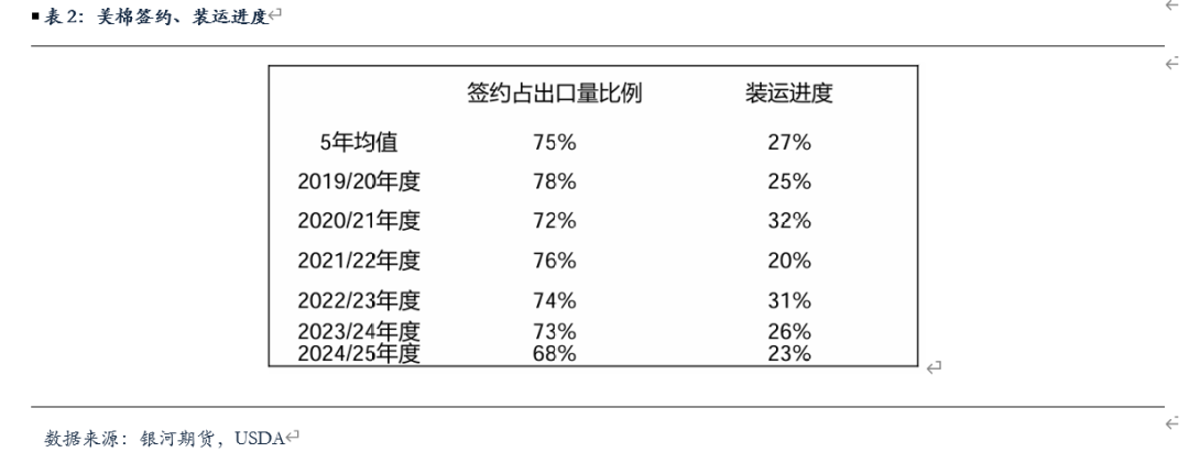 需求端从美棉签约情况来看,根据USDA最新出口销售数据,截至12月12日,美棉累计签约量为163.45万吨,当前签约进度为68%,较五年均值落后7个百分点;美棉累计装运情况来看,美棉累计装运54.69万吨,当前装运进度为23%,较五年均值落后5个百分点,目前签约进度仍处于历年同期较低的位置。