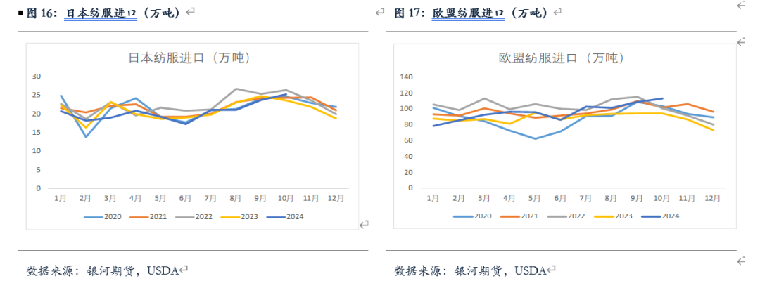 需求端,2024年前三季度整体表现较差,四季度出口情况开始有所好转,根据海关总署最新数据,1-11月我国纺织品、服装累计出口2735.42亿美元,同比增加0.2%。其中我国服装累计出口1445.7亿美元,同比减少2.5%;纺织品服装累计出口1289.69亿美元,同比增加3.4%。外需从新的一年预期来看,根据IMF数据显示,2025年全球GDP数据基本维持,其中欧、日2025年GDP有所调增。美国最近经济数据也体现了经济比较强劲,特别是特朗普上台可能有所提振。根据Tteb最新数据显示,欧盟、美国、日本下半年纺服进口量均有所回升,其中欧盟、美国纺服数据目前均处于历年同期较高位置。但是东南亚等其他制造业国家由于美国准备要提高关税政策,对其有负面影响,可能相对偏弱,GDP增速可能有所下降。