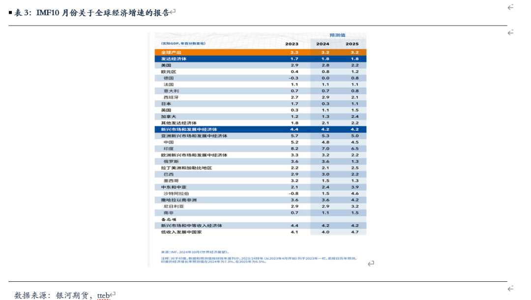 (一)宏观层面:明年国际方面,2025年宏观层面对大宗商品影响的两个主要影响因素主要是货币宽松方面和国际环境的不确定性增加,一方面全球进入放水周期,宽松的货币政策对大宗商品估值有一定的影响,另一方面是地缘政治以及特朗普上台对全球的贸易环境带来的的不确定性的影响。对于2025年我国宏观政策来看,12月9日的中央政治局会议对于2025年的经济释放了更加积极和明确的信号:“超常规逆周期调节”成为关键词,货币政策基调由“稳健”转向“适度宽松”,消费提振被提升至经济工作的首要任务,财政政策从“积极”升级为“更加积极”。