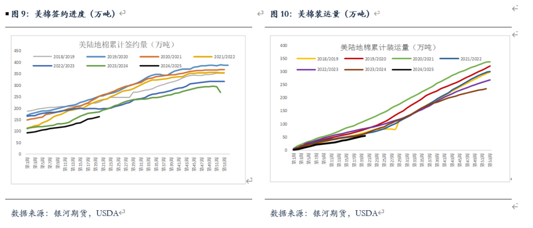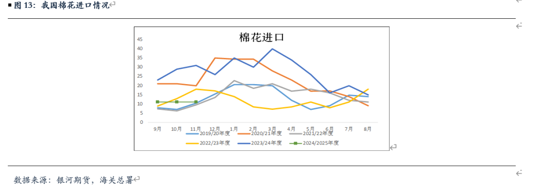 进口棉方面,上一年度棉花进口较高,23/24年度我国棉花进口325万吨,市场有传言进入储备棉库存。最近棉花进口量相对较低,根据海关总署最新数据,24/25年度9-11月我国棉花进口量在33万吨,处于往年同期偏低的位置。如果未来中美关系相对紧张,进口棉量受其影响可能会持续处于历年同期较低位置,