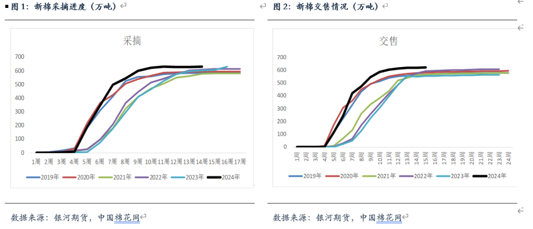 (二)产业逻辑:国内情况,目前国内外棉花相关性受贸易限制而有所减弱,就国内而言,目前处于新棉上市期,按照目前产量预测以及结合当前加工情况来看,预计2024/25年度新疆棉花产量大增,棉花供应量较充足。新年度由于棉花直补政策使得棉农收益有保障,因此预计新疆地区棉花种植面积大概率维持甚至有略增的可能。而天气方面预计明年出现极端天气的可能性较小,因此预计供应端变数不会很大,但是新一年中美关系、以及储备棉政策存在较大不确定性,可能会对郑棉走势带来一定影响。需求端来看,纺织行业整体表现欠佳,订单情况受弱需求主导,虽然明年政策端预计刺激消费,但对纺织行业的而言短期内刺激可能相对有限,下半年可能受影响更多一些。因此预计郑棉走势前期表现震荡偏弱为主,后期如果消费好转,棉花价格可能会出现反转。