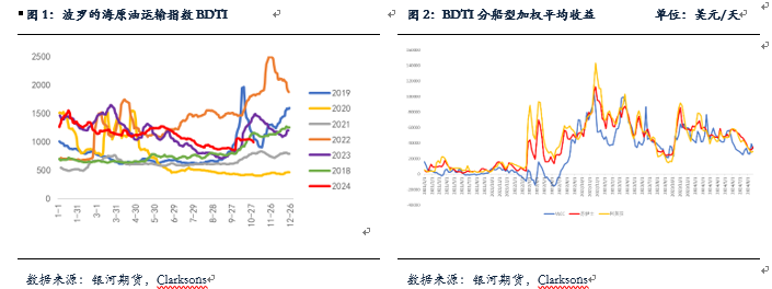 一、原油油轮运价截至12月20日,原油油轮2024年均值为1095.2,同比-4.71%,价格中枢下移。全年呈现震荡下行走势,在9月底跌至年内最低点(860点)后反弹,11月开始再次下探。整体来看,季节趋势较为明显。分船型来看,VLCC、苏伊士和阿芙拉船型长周期加权平均收益分别为39589、47372和44527美元/天,同比-20.04%、-15.03%和-21.66%。VLCC、苏伊士和阿芙拉船型TCE分别为37381.88、33943.36和35203.97美元/天,同比+65.65%、-30.04%和-22.55%。具体来看,2024年上半年VLCC船型运价整体强于中小型原油油轮,呈现了淡季不淡的情况,VLCC运价甚至在年初呈现大幅跳涨的迹象,创十余年较好运价高度。而下半年受到原油需求国(中国等国家)采购偏弱的拖累、运价有所回调,旺季不旺与上半年呈现鲜明对比。