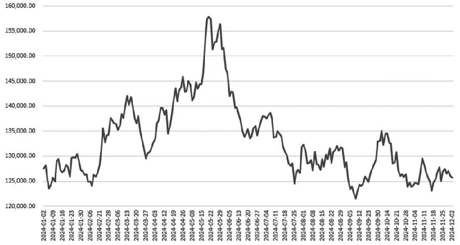 图为2024年沪镍期货主力合约价格走势(单位:元/吨)
