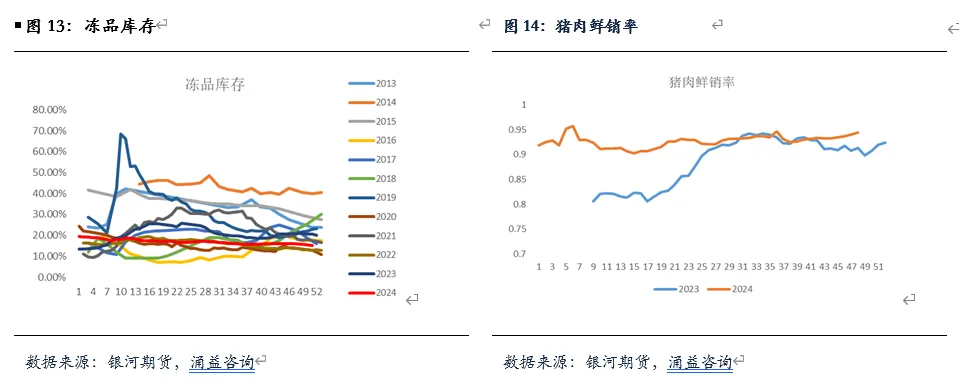 另一方面,今年冻品出库量整体相对较大,也一定程度反应终端承接能力相对比较良好,根据三方口径数据统计结果,今年冻品库存从前期19%持续下降至当前15%左右,整体鲜销率水平高于去年,去年8月前,总体肉品鲜销率低于今年,主要因去年出现了一定量的入库动作。在此背景下,国内除了消费了一定量的生猪,同时也消化了此前积累的一部分的冻肉库存,因此整体来看,今年猪肉消费表现其实相对尚可。