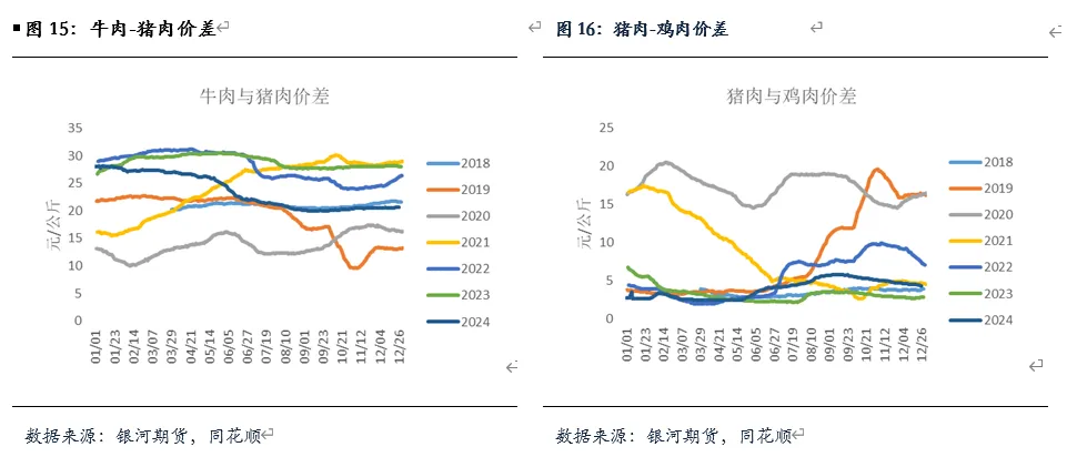 预计2025年猪肉消费可能会有进一步的增加,一方面,今年来猪肉消费较过去几年高价期间已经呈现一定好转态势,其主要原因在于此前高价对于猪肉消费形成了一定压制并导致市场消费习惯出现了改变,尤其在近年来禽以及反刍等产能持续扩张的背景下,对于猪肉的挤占和替代也在逐步增加。随着猪肉价格逐步回落,市场消费已经开始有一定改善迹象。今年由于猪肉价格出现上涨,导致猪肉与其他肉品竞争优势有所减弱,在一定程度上减少了猪肉的消费,但是今年由于牛羊以及禽产能的减少,预计猪肉消费替代可能会有一定程度增加。