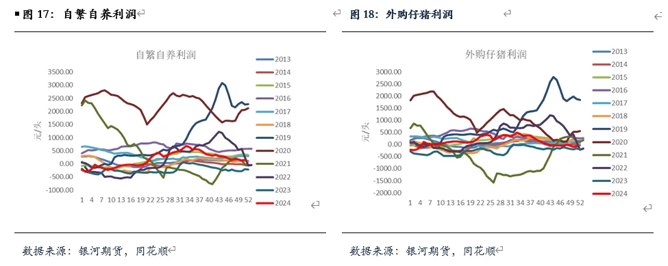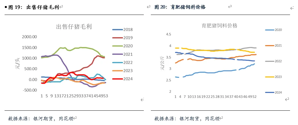 今年生猪养殖利润整体比较好,2024年全年自繁自养平均利润在170元/头,外购仔猪利润124.74元/头,这一利润水平已经基本持平于2022年水平,但外购仔猪养殖利润相对较差,主要原因在于今年仔猪价格上涨相对前置,吸收了一部分的涨幅,因此可以看到今年出售仔猪毛利可以达到123.55元/头,高于2022年的42.88元/头,如果将出售仔猪毛利与外购仔猪养殖利润进行综合评估,可以看到2022年与2023年养殖利润结构是比较接近的。2022年养殖利润的恢复一方面来源于2021年深跌后市场抛售所带来的产能去化,另一方面,其本身压栏带来的增量也将养殖亏损释放到了此后一年,这是2022年利润好转的主要逻辑。因此,从某种程度来看,今年的产能情况可以与2022年情况进行类比。