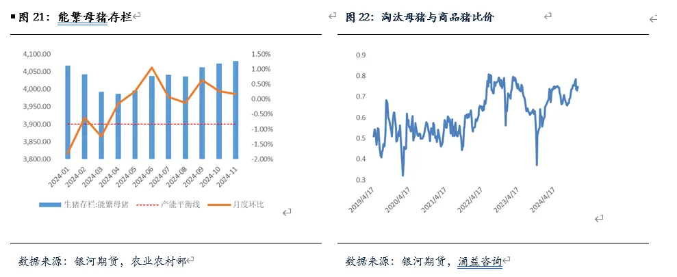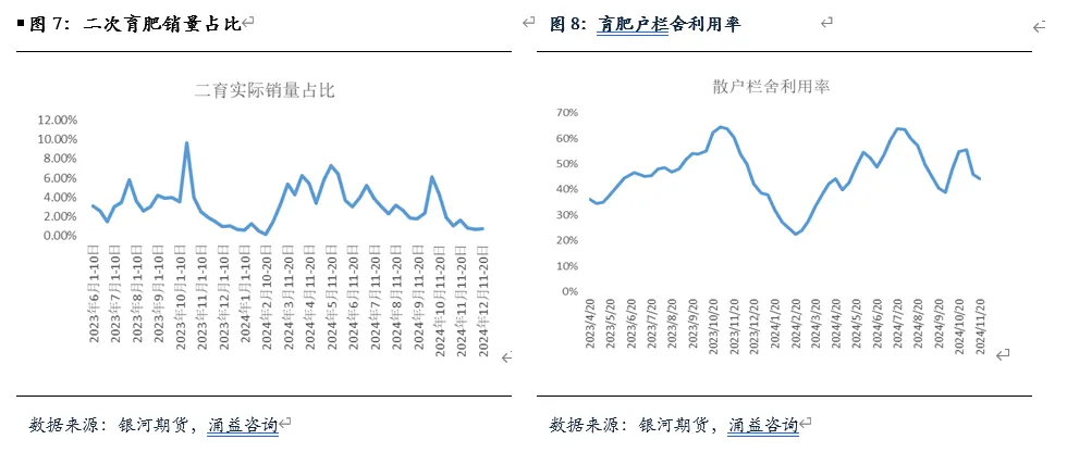 2025年生猪出栏量预计呈现增加态势,从仔猪供应端数据来看,今年下半年以来,新出生仔猪同比已经开始全面转正,同时今年没有看到明显的疫情,在此背景下,预计明年生猪出栏量至少在上半年会维持同比增加趋势。对于下半年主要参照当前能繁的补栏以及配种情况,根据涌益的配种率数据来看,当前母猪配种并没有出现下降,同样维持高位,因此在生猪生产性能变化不大的情况下,生猪出栏量预计将维持偏高水平。