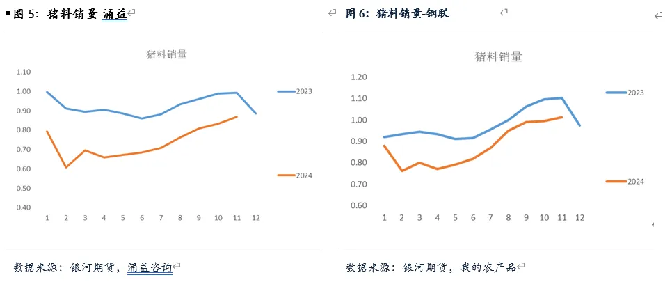 2024年生猪市场行情波幅明显加大,整体呈现前期大幅上涨随后回落的态势,价格表现特点与2022年情况比较类似。今年猪价大幅上涨的主要原因是由于去年冬季疫情带来的产能去化,从价格上涨幅度以及时机出栏量和产能的关系来看,去年疫情影响较大,且主要体现在商品猪上,仔猪同样也相对较大,但对于母猪影响相对有限。因此,在生猪市场缺口逐步缓解后,猪价再度回归供应端定价逻辑,价格呈现快速回落状态。今年供应端上散户减量比较明显,饲料销量数据的同比大幅下降反应了散户产能的去化,但规模企业仍然表现出比较明显的增量,因此可以看到总体出栏量的下降并未能彻底改变市场高供应的特点。需求方面来看,今年猪肉消费表现并不算太弱,一方面,虽然今年生猪出栏量较去年有一定幅度下降,按照相对具有可参考性的统计局数据来看,同比降幅大约在3.15%左右,但生猪出栏体重其实增加较多,部分口径显示增幅预计在2%以上,因此,实际猪肉产量减幅有限,并且,今年冻品出口数量相对较大,最终也流入消费市场,但相比之下,今年整体猪价呈现上涨态势,意味着较充足的供应主要有良好的消费作为支撑。今年总体社零数据继续呈现增长态势,另外,猪肉近年来逐步增多也使得部分需求得以修复。今年猪价的阶段性反弹使得养殖企业现金流得以一定程度修复,因此,总体来看,能繁母猪存栏在年内呈现增长态势,得益于企业的主动补栏以及淘汰数量的减少。