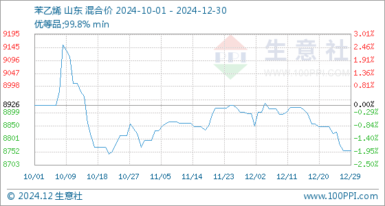 12月30日生意社苯乙烯基准价为8756.00元/吨