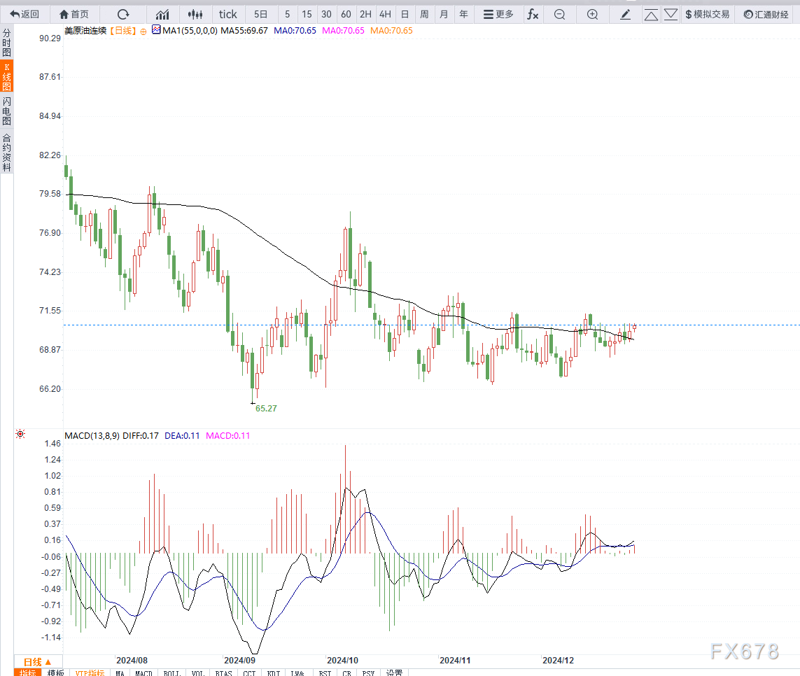 汇通财经APP讯——周一(12月30日)美原油亚盘时段小幅上涨,交投于70.68美元/桶附近,基本面上美国能源信息署(EIA)周五公布的数据显示,