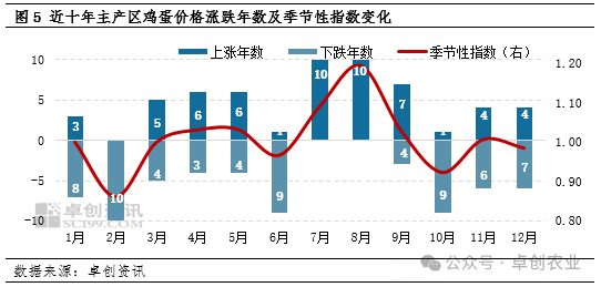 根据近十年鸡蛋价格的季节性指数与涨跌年数可以看出,一季度蛋价先跌后涨的概率较大。其中2月份跌幅较为明显,3月份或有小涨可能。因此从历史规律来看,一季度蛋价或先跌后涨,但仍然受供需关系变化的影响。