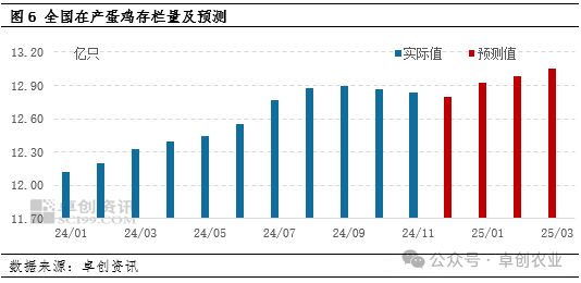 供应量呈增加趋势。根据影响产蛋鸡存栏量的重要指标补栏量、出栏量、上月存栏基数等,可推断2025年1-3月产蛋鸡存栏量理论值环比增幅分别为0.94%、0.46%、0.54%,在产蛋鸡存栏量将呈现持续增加趋势,3月份或突破13亿只,鸡蛋供应充足的局面仍将持续,对行情形成利空压制。