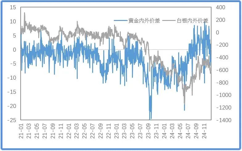 近期人民币汇率影响较前期走弱,上周黄金白银内外价差有所回落;内外比价有所回落。