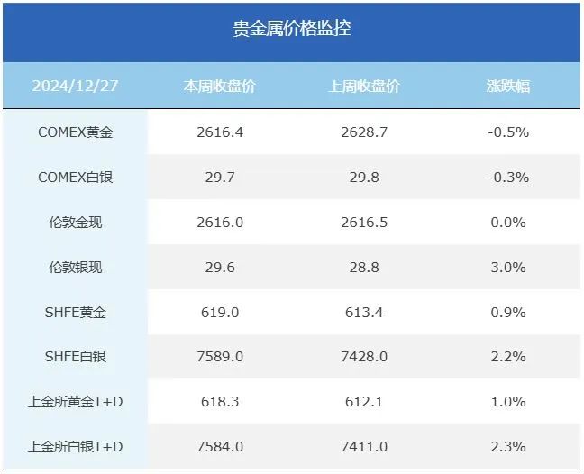 贵金属价格上周窄幅震荡,COMEX金银于2623-2656美元/盎司、29.8-30.5美元/盎司区间内运行。上周美元指数及美债收益率于高位震荡,金价承压于低位运行,而后海外处于圣诞假期,贵金属价格整体相对平静,国内金银价格跟随。