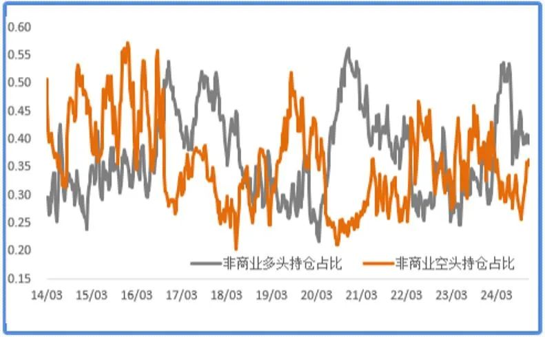 持仓方面,从CFTC持仓来看,上周非商业空头占比继续增加,与价格震荡偏弱匹配,目前空头持仓占比仍在相对低位。