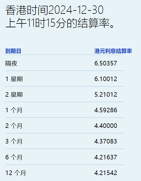 12月30日,港元拆息全线上升,其中,隔夜息抽升132基点,高见6.50375%,而与楼按相关的一个月拆息亦连升九天,报4.59286%,续创10月8日后新高。一周拆息涨56基点报6.10012%。反映银行资金成本的三个月拆息微升至4.37083%,为12月12日以来最高,六个月拆息报4.21637%,十二个月期亦升至4.21542%。