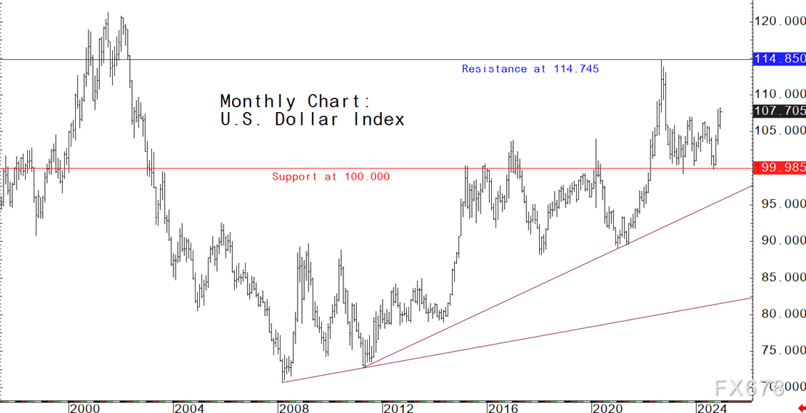 美元指数最近触及两年高点,并且在图表上呈走高趋势。事实上,美元指数的月度图表显示,自 2008 年以来,价格一直处于上升趋势。值得注意的是,货币市场的趋势往往比其他市场的价格趋势更强、更持久。虽然 美元指数的上升趋势已经成熟,已有 16 年历史,但没有强有力的早期技术线索表明该指数将很快形成主要市场顶部。
