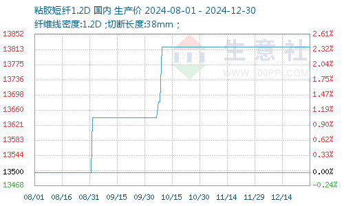 据生意社商品行情分析系统显示,截止12月30日,1.2D*38mm粘胶短纤国内地区出厂报价为13820元/吨,与月初价格持平,较年初价格上涨7.13%。