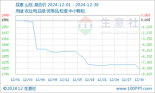 据生意社商品行情分析系统,截止12月30日,国内尿素市场参考均价为1811元/吨,较12月1日参考均价1981元/吨,国内尿素市场价格下跌幅度为8.56%。
