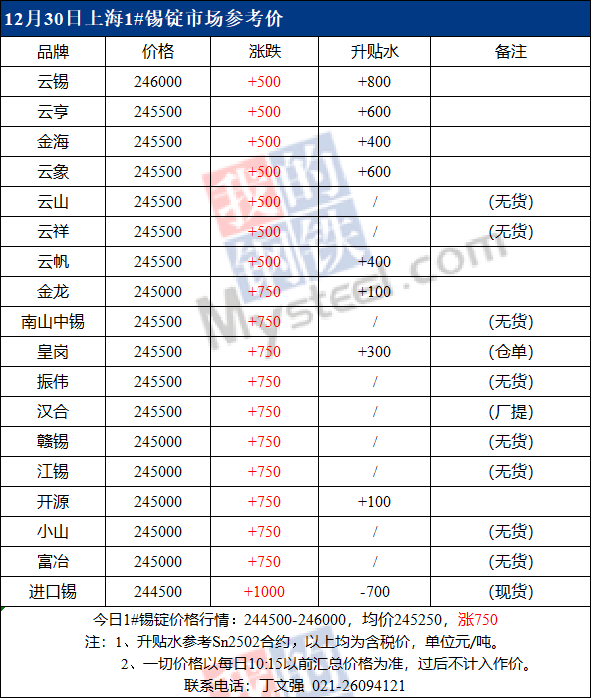 12月30日Mysteel上海现货锡锭报价244500-246000元/吨,均价245250元/吨,较上一交易日涨750元/吨。Mysteel15:30上海现货锡锭成交价格242500-247500元/吨,均价245000元/吨,较上一交易日涨1250元/吨。