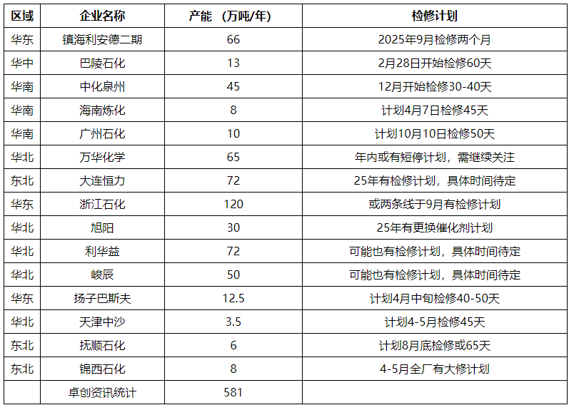 目前统计2025年计划检修的产能预计有581万吨,较2024年计划检修产能397.2万吨增加46%,但2025年计划检修损失量预计在54万吨,较2024年计划损失量(46万吨)增加17%。从上图来看,2025年检修损失量或集中在3-5月、9-10月,可提前关注检修计划对行情带来的影响。苯乙烯的装置检修大多是配合上游重整或者裂解装置的全厂大检修,同时配套有下游装置的,也基本同步检修,故需视该检修企业对外销售量的多少来评估价格影响力度。从下表检修计划来看,东北及华北的检修计划相对多,且影响区域内现货及部分船货,对价格的影响或相对大。