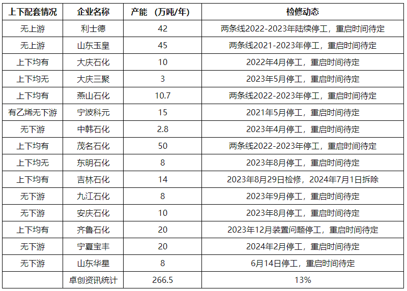 2023年陆续停工装置增多,2024年利润亏损进一步增加的行情下,停工企业继续停工,故2024年长停装置带来的损失量较2023年增多。目前已经统计的长停装置产能在266.5万吨,包含拆除的吉化14万吨/年的装置,占行业总产能的13%,拉低了行业的整体开工负荷。2024年实际检修损失量未统计长停装置约在187万吨,计划检修损失量在46万吨,超出3倍水平。但通过计划检修损失量也大致判断出4月、11、12月检修计划较多,对行情的提前预判也起到一定辅助作用。