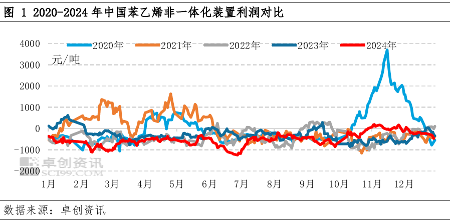 年内装置扰动继续直观的影响着阶段性价格的波动,装置变化受到利润的影响、与配套上游装置同步大检修、更换催化剂、装置故障等多方面因素的影响。今年苯乙烯行业利润亏损力度较去年进一步扩大,也影响着苯乙烯企业长期停工的产能增加。2024年中国苯乙烯非一体化装置利润均值在-511元/吨,较去年(-310元/吨)减少64.84%。年内亏损力度较大的月份有2月、6月,在这两个时间段前后,行业内有装置选择停工,也有多套装置选择降负荷。