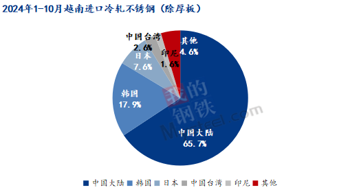 据Mysteel数据监测发现,2024年以来,越南不锈钢冷轧卷板进口以中国大陆为主,约占66%,其次为韩国约占18%。中国台湾和印尼占比2%,马来西亚占比0.9%。