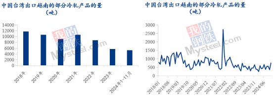 据Mysteel数据监测发现,近7年,中国台湾不锈钢出口越南的该产品的量呈现震荡下降态势,2023年和2024年处于近7年的底部。2024年以来,该量相对平稳,约在450吨/月附近。