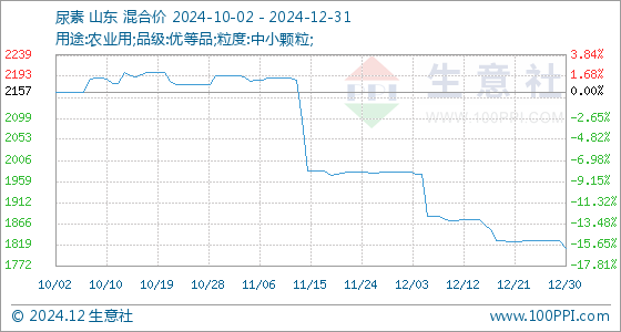 12月31日,生意社尿素基准价为1811.67元/吨,与本月初(1981.25元/吨)相比,下降了-8.56%。