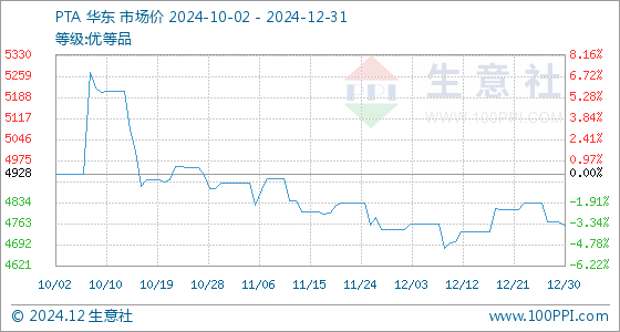 12月31日,生意社PTA基准价为4759.00元/吨,与本月初(4741.00元/吨)相比,上涨了0.38%。