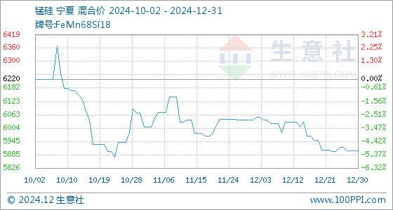 12月31日,生意社锰硅基准价为5904.00元/吨,与本月初(6040.00元/吨)相比,下降了-2.25%。