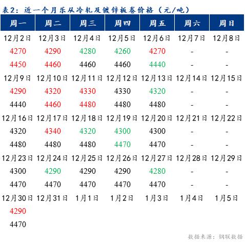 价格方面:截止2024年12月30日17:30,乐从地区冷轧板卷市场价格4290元/吨,镀锌板卷市场价格4470元/吨。