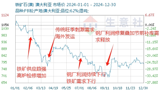 据生意社铁矿价格数据显示,2024年铁矿价格先大幅下跌,随后宽幅震荡,整体呈趋弱震荡走势,具体如上。2024年涨跌表现主要分为四个阶段:其一,1-3月份受海外发运增长、港口库存高位等利空因素,导致矿价下行;其二,在4-5月间,随着传统旺季行情发酵,钢厂利润修复后刺激铁矿需求释放,所以矿价开始反弹;其三,进入6月份,由于下游钢材市场行情走弱,而生产成本上行导致钢厂利润情况下行,铁水产量也随之缩减,钢厂自发检修,让矿价一度回落;其四,9月之后宏观政策再度发力提振市场信心,港口库存开始出现去库趋势,钢厂库存下降后对矿价形成一定支撑,因此矿价维持在一定区间内波动。