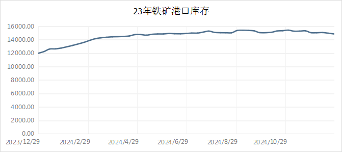 供应方面,附2024年铁矿港口库存总量图,具体如上。24年铁矿发货总量减少主要在于国际环境以及天气对矿企的影响,不过随着国际形势逐步稳定,矿企的发货量会开始稳定。据数据师了解,24年11月份进口矿10094万吨,预计12-次年1月份,海关口径月度进口矿在1.0-1.1亿吨左右。11月国产精粉在2256万吨左右,预计12-次年1月份维持2200万吨左右。海外铁矿供应中澳大利亚和几内亚的新供应将进入市场,而尽管印度出口下降和中国国内供应减少,供应情况大概率维持过剩。中长期看,海外铁矿供应维持增加趋势。