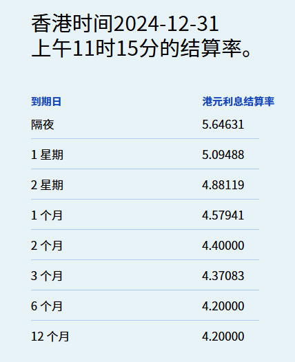 12月31日,港元拆息于年结日走软。其中,隔夜息由上日的6.50357%纪录高位回落85基点,至5.64631%,而与楼按相关的一个月拆息连升九天后,今日亦跌至4.57941%,续创10月8日后新高。