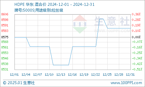 据生意社商品行情分析系统监测,HDPE(2426H)12月1日国内价格在8575元/吨,12月31日均价在8587元/吨,期间报价上涨0.15%。