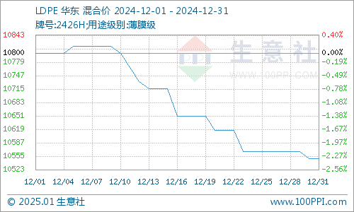 据生意社商品行情分析系统监测,LDPE(2426H)12月1日国内价格在10800元/吨,12月31日均价在10550元/吨,期间报价下跌2.31%。