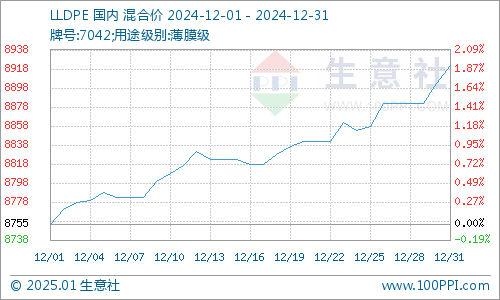 据生意社商品行情分析系统监测,LLDPE(7042)12月1日国内价格在8755元/吨,12月31日均价在8921元/吨,期间报价上涨1.90%。
