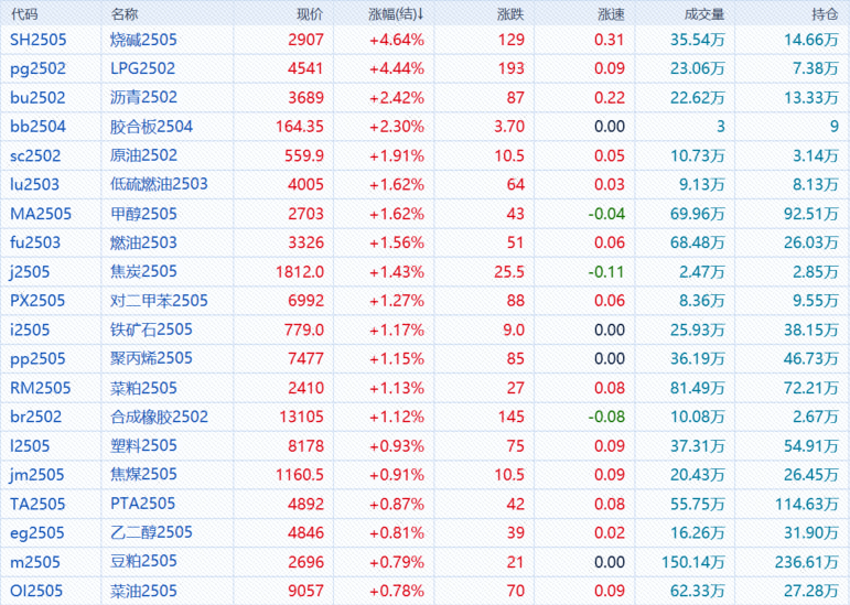 12月31日,午盘收盘,国内期货主力合约涨跌不一。液化石油气(LPG)、烧碱涨超4%,沥青涨超2%,SC原油涨近2%。跌幅方面,工业硅、集运欧线跌超2%,棕榈油跌超1%。