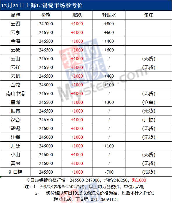 12月31日Mysteel上海现货锡锭报价245500-247000元/吨,均价246250元/吨,较上一交易日涨1000元/吨。Mysteel15:30上海现货锡锭成交价格244000-247000元/吨,均价245500元/吨,较上一交易日涨500元/吨。
