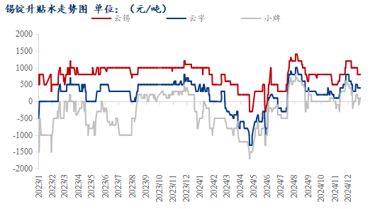 今日套盘商对沪锡2502合约套盘云锡升水800元/吨左右,普通云字升水400-600元/吨左右;小牌升水100元/吨左右,进口锡贴水700元/吨左右。