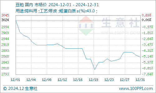 据生意社商品分析系统显示:12月豆粕价格反弹乏力,价格持续弱势下跌。12月1日,豆粕市场均价3024元/吨,12月31日,豆粕市场均价2866元/吨,价格下跌5.22%。