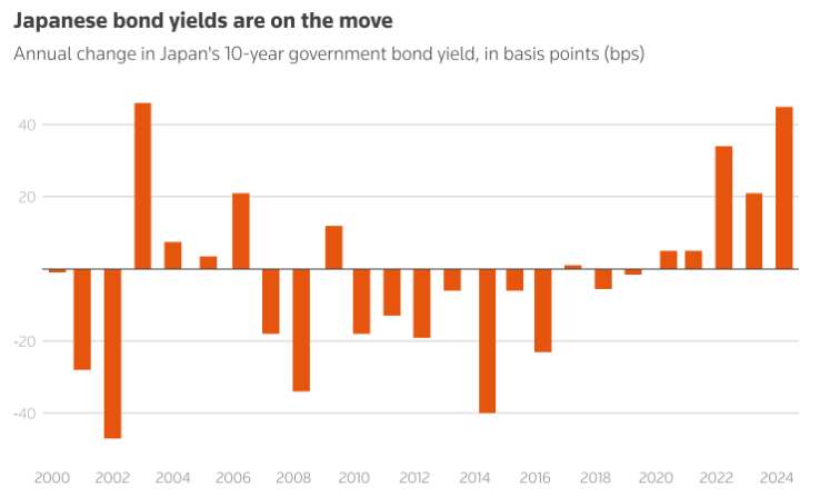 美国10年期国债收益率在2024年上涨近70个基点,英国10年期国债收益率跃升107个基点,德国10年期国债收益率上涨33个基点。在日本,由于通胀加速,该国利率今年两次上调,日本10年期国债收益率上升47个基点,创下2003年以来的最大年度涨幅。