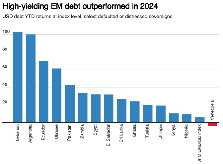 债券投资者2024年的收益来自一些风险最高的市场。由于投资者预计中东冲突将削弱武装组织真主党,黎巴嫩违约的美元债券全年回报率约为100%。一项雄心勃勃的改革计划和特朗普重返白宫的前景推动阿根廷发行的美元债券获得了100%的回报,阿根廷领导人哈维尔.米莱(Javier Milei)与美国当选总统关系密切。受特朗普可能结束俄乌战争的押注推动,乌克兰债券的回报率超过了60%。