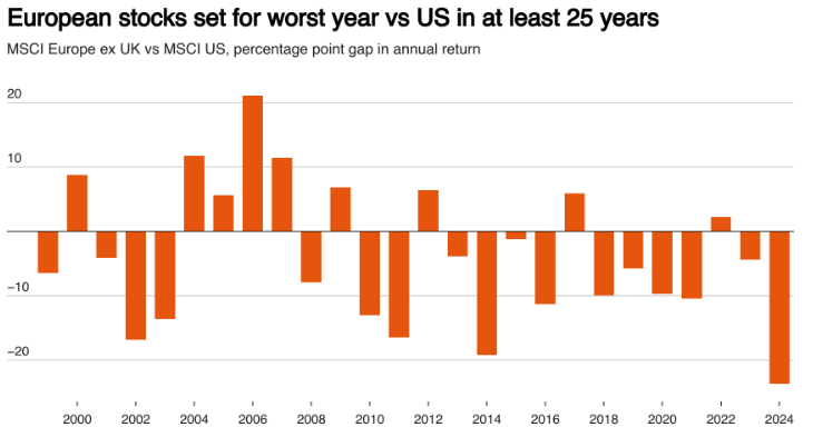 欧元兑美元汇率今年下跌了约5.7%,而欧洲股市相对于美国股市的表现至少是25年来最差的。在欧洲央行四次降息后,欧元区经济下滑速度放缓,一些预测人士预计欧洲经济将在2025年反弹。