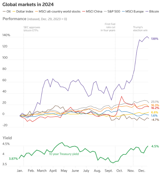 全球股市上涨在很大程度上要归功于美国股市连续第二年大幅上涨,人工智能热潮和强劲的经济增长吸引了更多的全球资本进入美国资产,推动美元兑其他货币在2024年上涨了6.6%。在特朗普于11月5日赢得大选后,美国的繁荣情绪上升,因为交易员们关注的是这位当选总统的减税和放松管制计划,动物精神的飙升推动加密货币比特币的年涨幅达到122%。