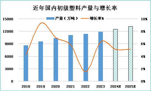 我国塑料市场消费需求庞大。新世纪以来,国内塑料行业实现了跨越式的发展,产品种类和产量都得到了长足的进步。尤其是近五年,据统计,2020年我国初级形态塑料总产量首次突破10000亿吨。2020年至2024年平均年产增速保持在5.14%以上,以全球占比33%的体量稳居世界主要塑料生产基地之一的地位。若保持此增速,预计到2025年底,国内初级形态塑料年产或将达到13151.74万吨。