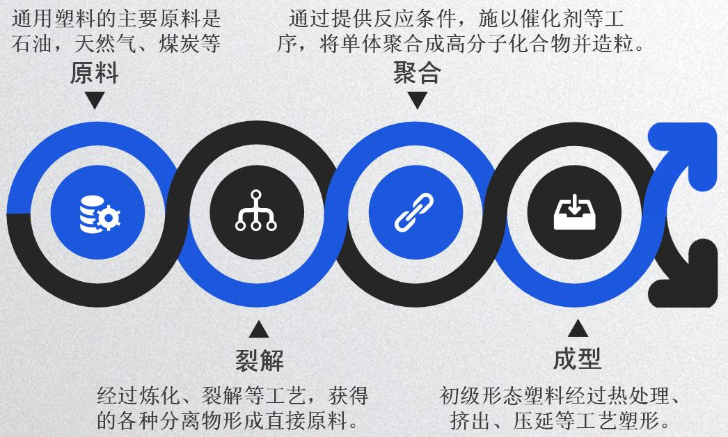 通用塑料门下主要包括聚乙烯(PE)、聚丙烯(PP)、聚氯乙烯(PVC)、聚苯乙烯(PS)与丙烯腈-丁二烯-苯乙烯共聚树脂(ABS)等商品。虽然其内涵与成员会随着科学技术的发展而有所变化,但其“通用”之名的核心共同点无外乎应用广泛、价格低廉、产量大。无论作为生活必需品,还是在工业生产中,亦或是作为金融产品,都有着无可取代的重要地位,故又称之为大宗塑料品种。